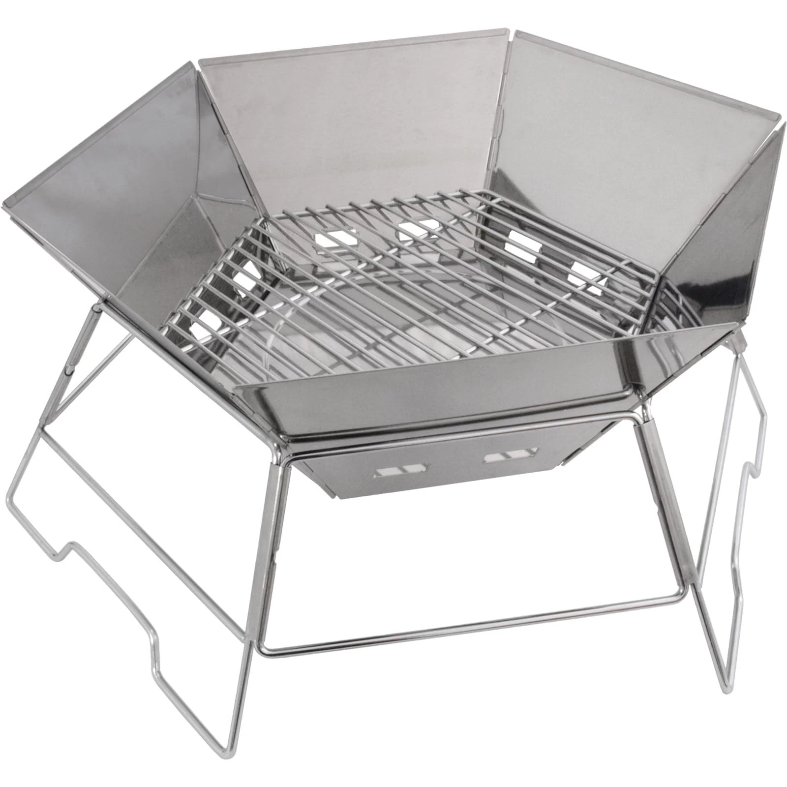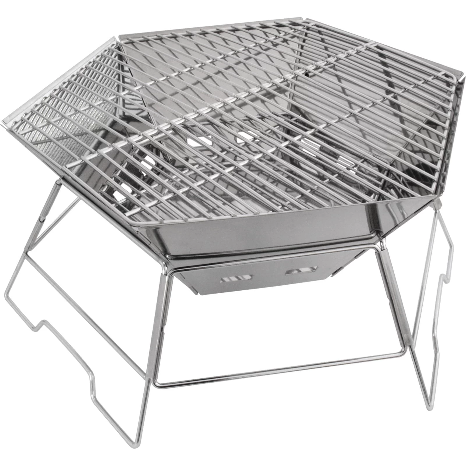 Der Hexagon von Origin Outdoors ist ein kompakter und praktischer Grill mit großer Grillfläche. Die sechseckige, zusammenfaltbare Bauweise begünstigt das kompakte Packmaß, ermöglicht einen schnell Auf- und Abbau und steht stabil am Boden. Durch seine Bauweise ist er auch als Feuerschale verwendbar. Weiterhin verfügt der Grill über eine einlegbare Bodenplatte, einen Kohlerost und einen großen, mittig zusammenklappbaren, Grillrost. Die faltbaren Wandsegmente sind wie ein Windschutz konstruiert und schützen die Glut vor starkem Wind. Die in den Wandsegmenten eingearbeiteten Luftlöcher befinden sich unterhalb des Kohlerosts und versorgen die Glut so perfekt mit Sauerstoff. Die Tragetasche aus Nylon ist im Lieferumfang enthalten.