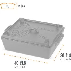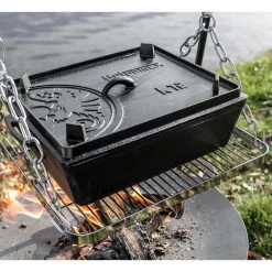 Mit der extragroßen Kastenform k12 versorgt man eine ganze Mannschaft in der Lagerfeuer-Küche. In der mit 8 Liter Füllvolumen geräumigen Form aus hochwertigem Gusseisen gelingen Brot mit krosser Kruste, überbackene Aufläufe und alle Arten von Fleischgerichten. Marinierten Wildschweinbraten mit Rotwein-Preiselbeer-Soße und Beilagen bereitet man in der sofort einsatzbereiten Kastenform aus Gusseisen ebenso zu wie Lasagne oder klassischen Kartoffelauflauf für eine große Gruppe von Draußen-Abenteurern. Der k12 ist ideal als Bräter, Auflaufform oder zum Brot- und Kuchenbacken. Mit dem Deckelheber (optional erhältlich, RL.402404) lässt sich der Deckel einfach und gefahrlos abnehmen. Dieser besitzt ein Rillenprofil, wodurch er auch als Steak- und Grillpfanne gut geeignet ist.