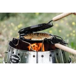 Das Wende-Waffeleisen ist eine gusseiserne Form von Petromax, mit der man sowohl herzhafte als auch süße Waffeln im Handumdrehen zubereiten kann. Mit dem dazugehörigen Auflagegestell erhält man eine passgenaue Grundlage, auf der man das Waffeleisen kippsicher und rutschfest auflegen kann. Die Waffelgussform besteht aus zwei Teilen, die durch ein Scharnier miteinander verbunden sind. Vorgeformte Einkerbungen verschaffen der gusseisernen Form eine feste Position im Gestell. Durch den Verschlussmechanismus wird das Eisen zusammengehalten und bleibt auch während des Wendevorgangs sicher verschlossen: So fließt dein Waffelteig nicht aus der Form. Mit Hilfe der naturbelassenen Holzgriffe kann man das Wende-Waffeleisen auch bei höheren Temperaturen problemlos mit einem Handgriff drehen. Die an der Seite langgeführte Gussnase bildet den Wendeanschlagpunkt am Auflagegestell. Dadurch lässt sich das Eisen um 180° drehen und erreicht anschließend wieder den richtigen Auflagepunkt am Gestell. Mit dem Wende-Waffeleisen geht das Zubereiten frischer Herzwaffeln leicht von der Hand. Dabei musst man auf den charakteristischen Geschmack, den traditionelles Kochen mit Gusseisen mit sich bringt, nicht verzichten. Wenn ein feuriges Drachen-Brandzeichen voll und ganz nach ihrem Geschmack ist, dann ist die drachenstarke Doppelfunktion vom Wendewaffeleisen genau das richtige für sie. Denn wo innen luftige Waffeln backen, ist auf der Außenseite mit großformatigem Drachenlogo-Druck auch das Backen von dünnen Pfannkuchen oder Teigfladen mit einen drachenstarken Logo-Abdruck möglich. Platz da: Zum Wenden benötigt das Wende-Waffeleisen ausreichend Spielraum. Daher ist es wichtig, dass das Auflagegestell etwas erhöht positioniert wird und zur Mitte hin genügend Platz nach unten gegeben ist. Bestenfalls beträgt dieser mindestens den Durchmesser des Waffeleisens. Das ist notwendig, damit man das Eisen frei bewegen kann und das Wenden auch reibungslos vonstatten geht. Eine ideale Draußen-Kochstelle, um das Wende-Waffeleisen zum Einsatz zu bringen, ist der Atago: Das Gestell des Waffeleisens passt optimal auf den oberen Rand. Gleichzeitig ist die Distanz zwischen dem Auflagegestell und dem Kohlerost groß genug, um die Waffeln mit indirekter Hitze backen zu können. Dadurch erzielt man beste Ergebnisse und hat ausreichend Abstand für geschickte Wendemanöver.