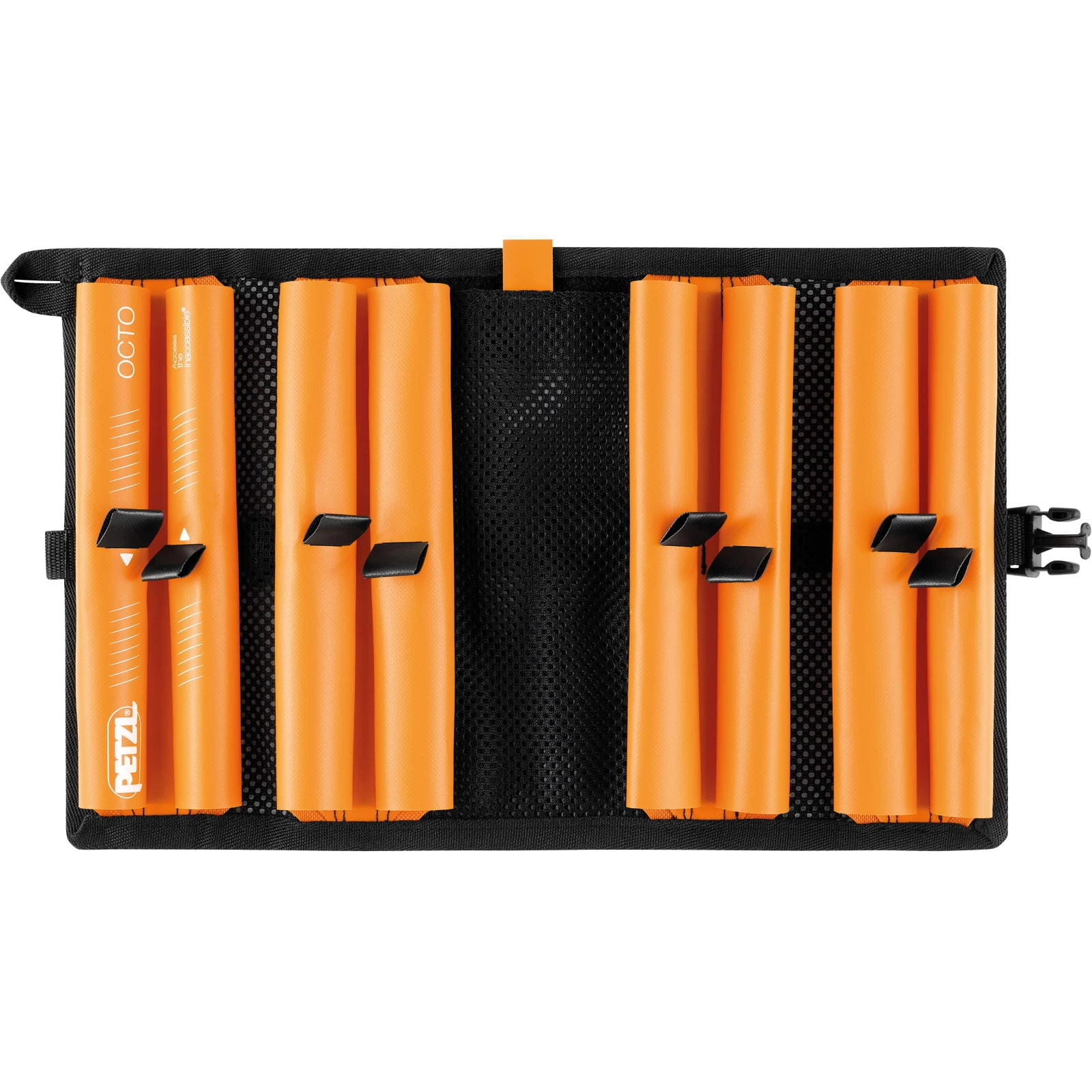 Die OCTO-Tasche von Petzl ist zum Verstauen, Schützen und Transportieren von Eisschrauben konzipiert. Sie verfügt über acht Fächer für ein komplettes Set von bis zu acht Eisschrauben sowie über ein Netzfach zum Verstauen von Zubehör (Feile, Ersatzhaue usw.). Zum Öffnen wird die Tasche aufgefaltet, um den Zugriff auf das Material zu erleichtern. Ein praktisches Detail, die Tasche lässt sich zum Trocknen des Materials aufhängen, ohne es herauszunehmen.