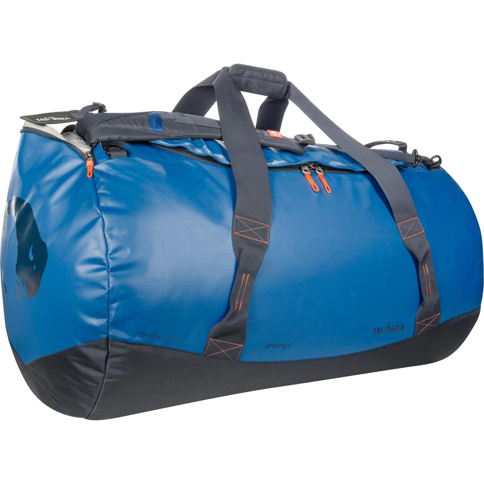 Extrem robuste und sportliche Reisetasche in Barrel in der Größe XXL (130 Liter Packvolumen) von Tatonka. Mit der Materialmischung aus Tarpaulin und Textreme gehört der Barrel XXL zu den Unverwüstlichen unter den Reisetaschen. Das Modell besitzt einen gepolsterten Boden, eine Netztasche unter dem Deckel und extrabreite Hand- und Schulterschlaufen. Zudem verfügt der Barrel XXL über zwei gepolsterte Schultergurte, die sich in einer versteckten Tasche komplett verstauen lassen und mit denen die Tasche wie ein Rucksack geschultert werden kann.