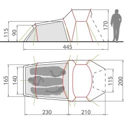 Merkmale: eine geräumige Apsis mit (fast!) Stehhöhe; ein Eingang; komfortabler Eingangsbereich; sehr schneller Aufbau durch Gestängeclip-System; hervorragende Belüftung durch Netzfenster; bestens geeignet zum Fahrrad- und Motorradfahren